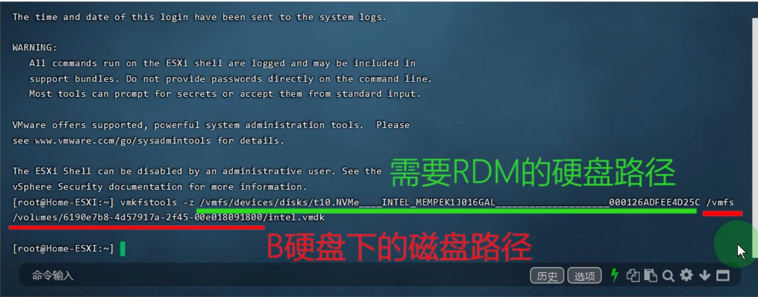 vmkfstools -z 需要直通的硬盘 当前esxi储存的路径/名称.vmdk